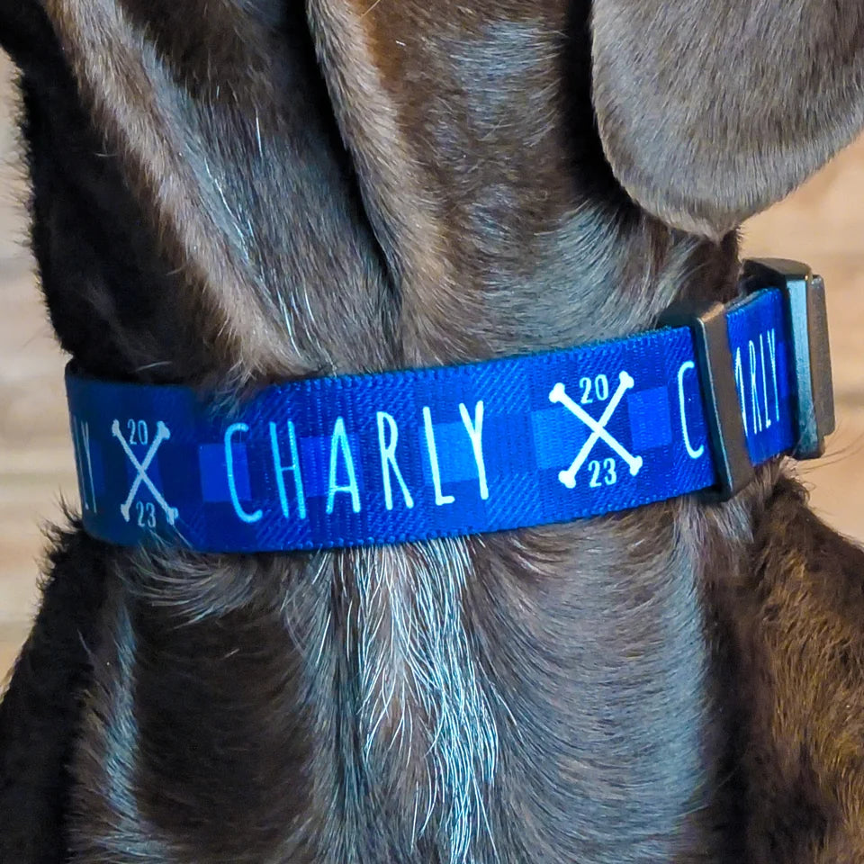 Bei diesem personalisierbaren Hundehalsband mit Knochenmotiv werden drei gekreuzte Knochen im Design dargestellt. In den Knochen wird das Geburtsjahr deines Hundes aufgedruckt. Name, Inhalte und Layout legst du selbst im Bestellprozess fest. Das Halsband wird nach deiner Bestellung individuell bedruckt.